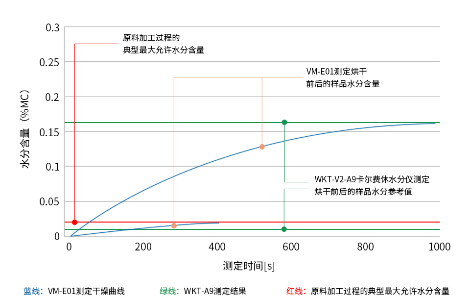 藍(lán)線:VM-E01快速鹵素水分測(cè)定儀測(cè)定的水分含量(平均值)。